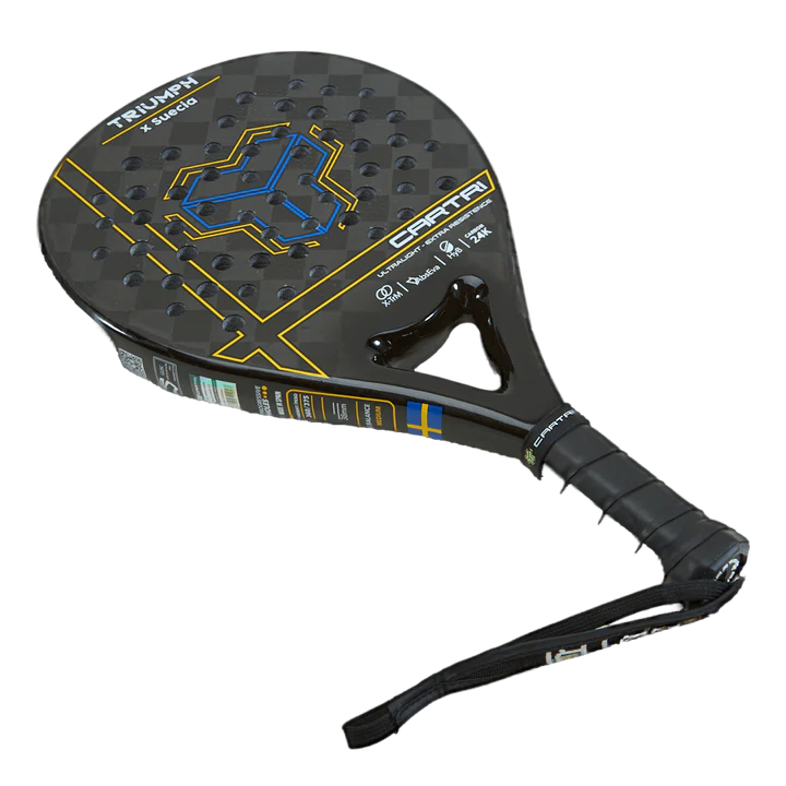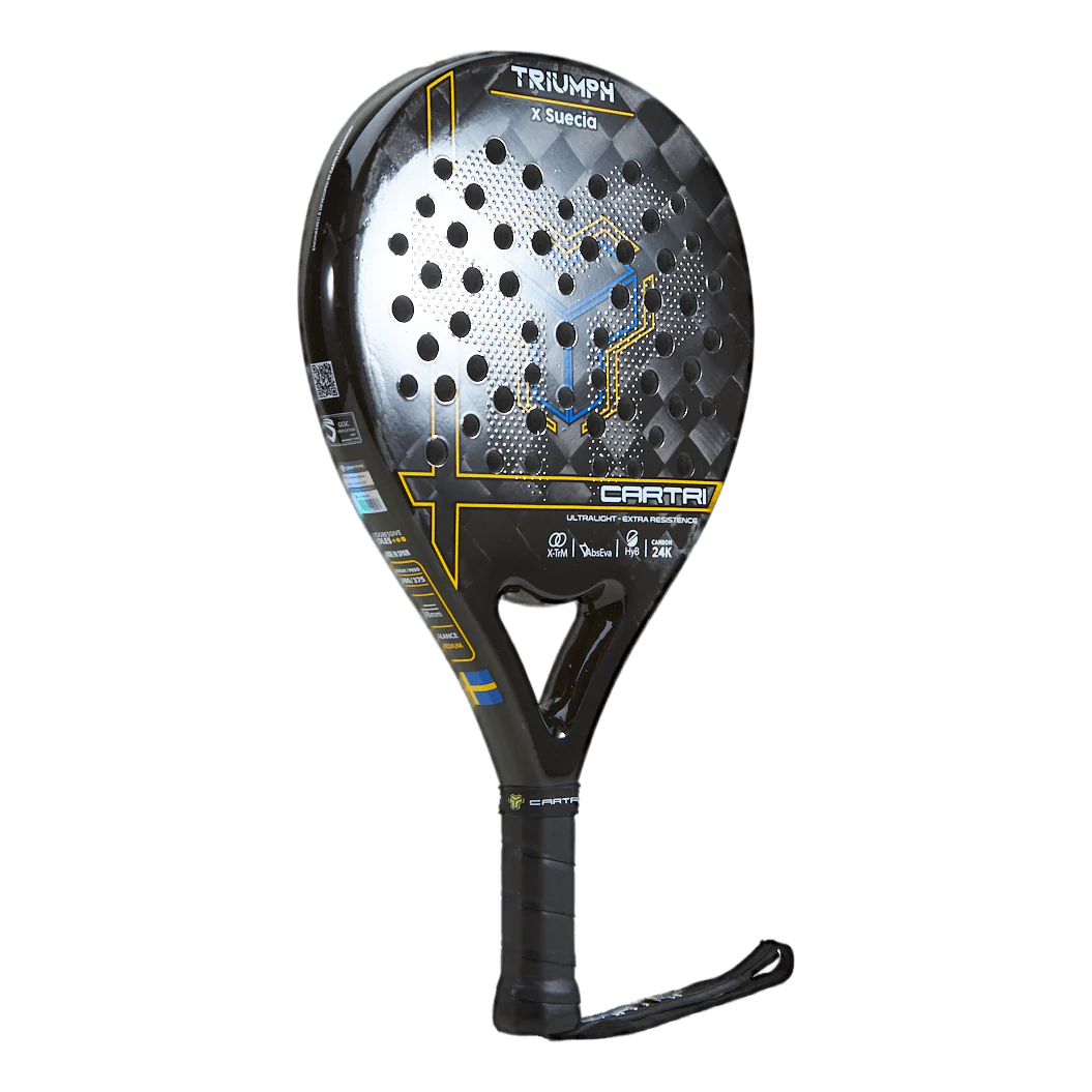 Cartri Triumph Suecia Black är ett premium‑padelracket tillverkat för mellannivå till avancerade spelare som söker en bra kombination av kraft, kontroll och stabilitet. Enligt specifikationer: vikt ~ 375 g, rund form, medelhög balans.